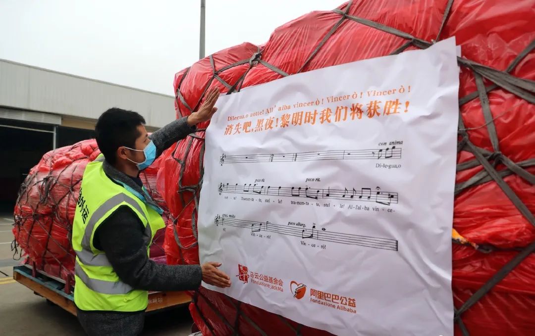 3月16日,马云捐赠的物资到达了比利时列日机场。在捐赠给比利时的物资上写着歌名“团结就是力量”,这也是比利时国徽上的字。在另一部分送往意大利的物资包装上,贴着一张硕大显眼的乐谱,这是意大利作曲家普契尼的歌剧《图兰朵》中一段咏叹调的曲谱,歌词是“消失吧,黑夜!黎明时我们将获胜!”